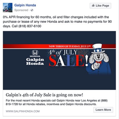 Galpin Motors worked with Turnkey Marketing on its week-long July 4 campaign, which targeted lead ads, link ads and carousel ads to men and women aged 24–65 who lived within 10–15 miles of its dealerships.
